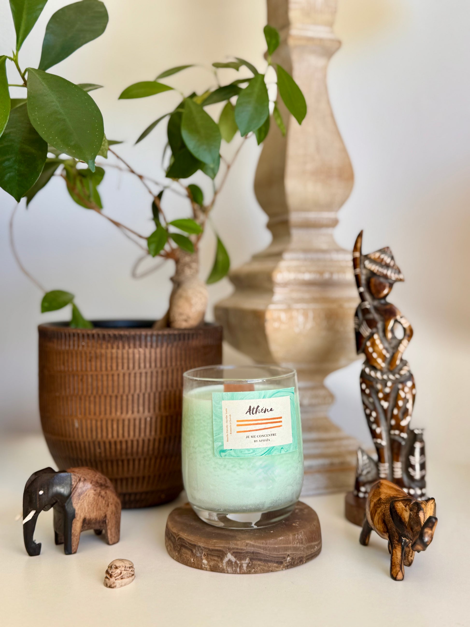 La bougie Athéna t’accompagne dans tes moments de réflexion, d’étude ou de création. Inspirée de la Déesse de la sagesse, elle ouvre un espace de lucidité et de concentration pour que tes idées se déploient avec justesse et précision.